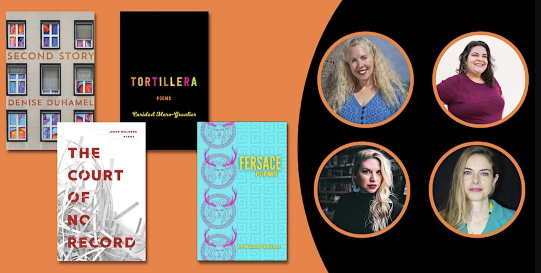 Books & Books is thrilled to present an evening with the poets Denise Duhamel, Jenny Molberg, Caridad Moro-Gronlier, & Nicole Tallman as they discuss their respective books: Second Story: Poems by Denise Duhamel (University of Pittsburgh Press, $18.00), Court of No Record by Jenny Molberg (LSU Press, $18.95), Tortillera by Caridad Moro-Gronlier (Texas Review Press, $19.95), Fersace by Nicole Tallman (Elj Editions, $22.00).